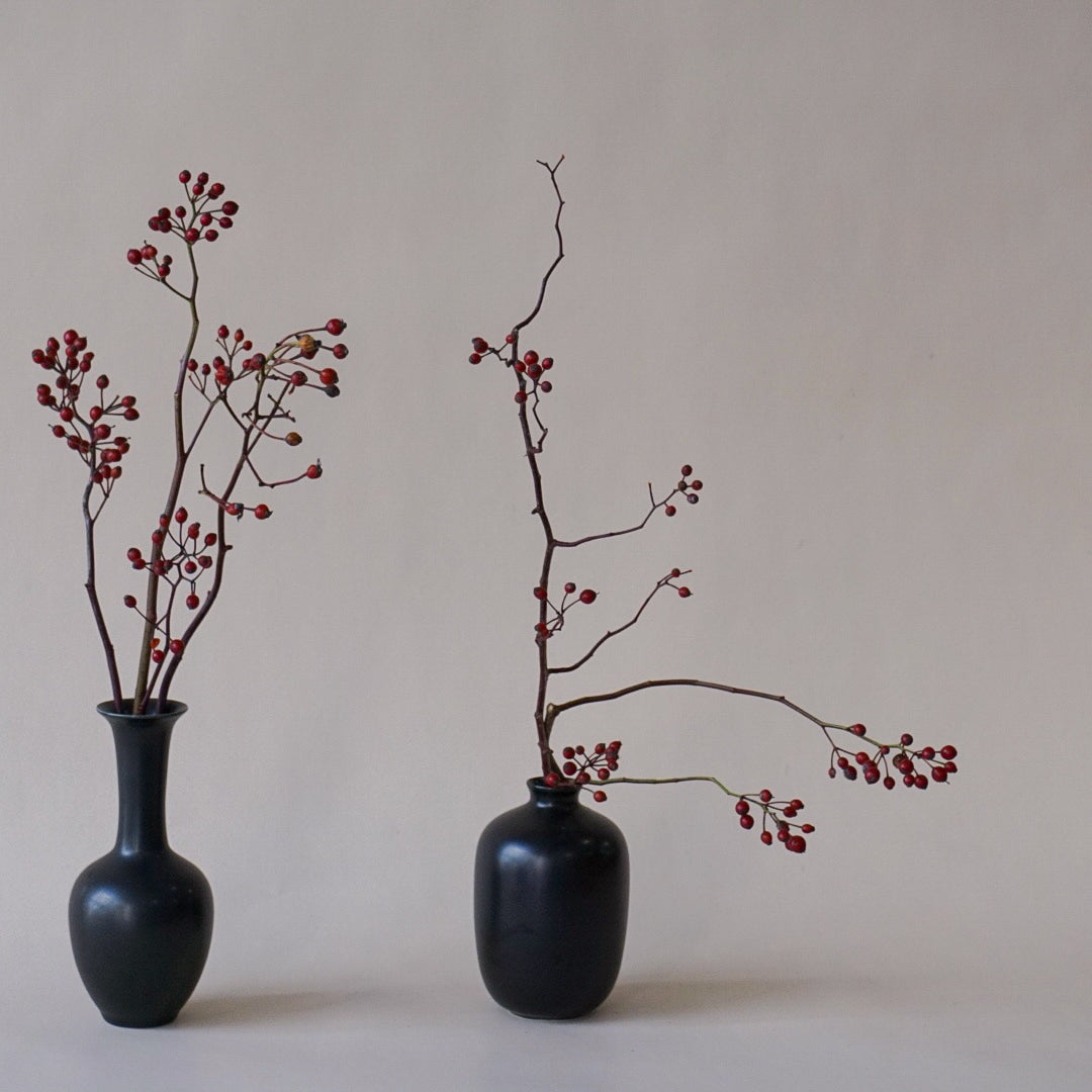 Festive — Designed in a sleek black bud vase and arranged with moody mulberries, rich burgundies, deep reds, and seasonal greens.
